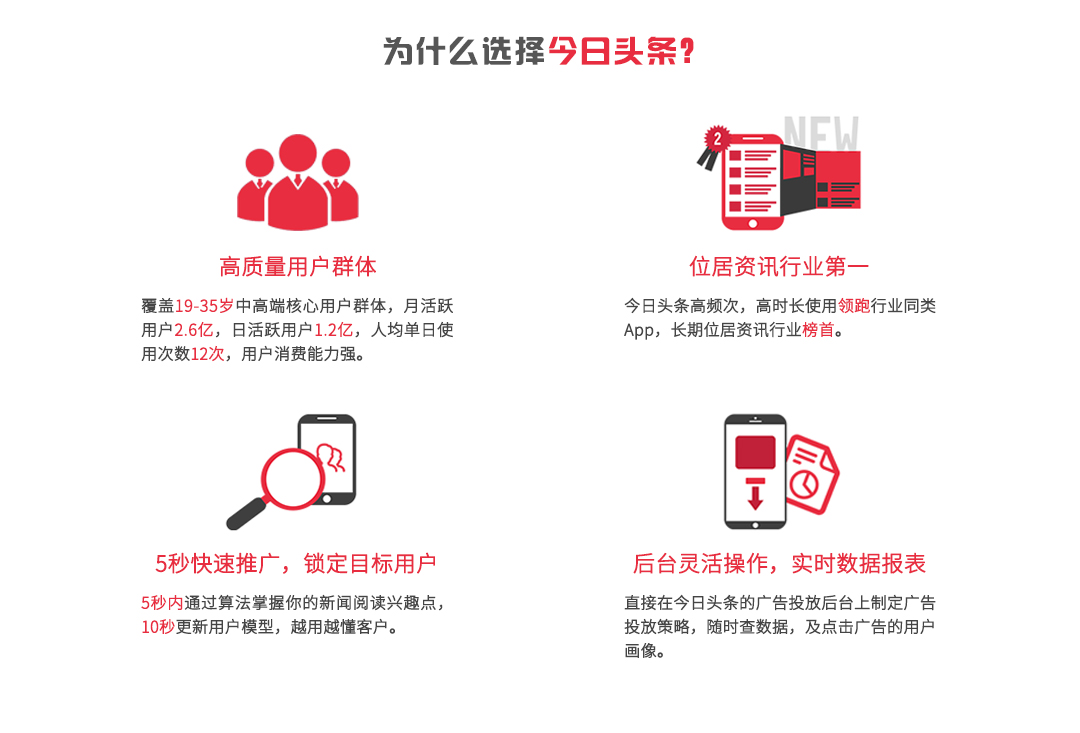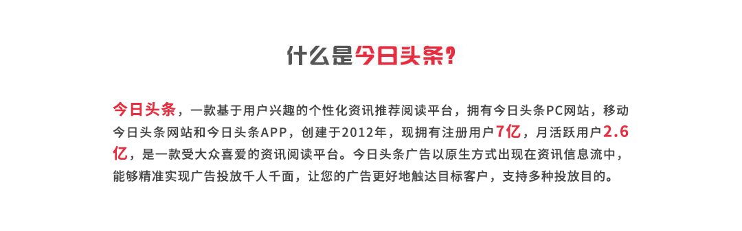 头条开屏广告具有强烈的视觉冲击力,瞬间捕获注意力,品牌信息充分曝光,并可以地域定向。适合需要品牌曝光或活动推广的广告主。